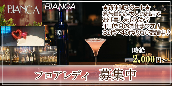 ☆*☆*☆*☆*☆*☆*☆ ★BIANCA★ <<フロアレディ 募集>> ☆*☆*☆*☆*☆*☆*☆ 30代~40代の方が活躍する、大人の雰囲気のお店で 一緒にお仕事始めませんか? 初めての方も大歓迎です! Wワークで働く社会人さんも多くいますので あなたのペースで無理なく働いてもらえればOK☆ どなたも安心して始めやすく、楽しく働けるお店です♪ ~・~・~・~・~・~・~ 平日だけのお仕事 ~・~・~・~・~・~・~ 週1日~・1日3h~OK! 土日が休みで、平日だけのお仕事なので プライベートも大事にできます♪ 休みの予定も立てやすく、働きやすさを大事にしています! 気になった方はお気軽にお問合わせ下さい☆ 【*待遇面充実*】 各種手当あり 昇給あり 日払いあり 自己申告制シフト 土日祝休み 終電あがりOK 遅出勤務OK WワークOK 私服OK 髪色・髪型・ネイル・ピアス自由 待遇面充実で安定して働けます♪ ◇◆◇◆◇◆◇◆◇◆◇◆◇ ☆仕事内容☆ ◇◆◇◆◇◆◇◆◇◆◇◆◇ 簡単なお酒を作ってご提供。 お客様とお話ししながら楽しく過ごしてください♪ 難しいことはありませんし、 お酒の作り方やお話しのコツも丁寧にお教えします! 初めての方も安心してくださいね♪ ぜひ体験入店で自分に合っているか確かめて下さい。 疑問があれば何でも質問して下さいね! 未経験や学生さん、友達同士での応募も大歓迎! 質問や相談、まずはお気軽にお問い合わせお待ちしております。 |
