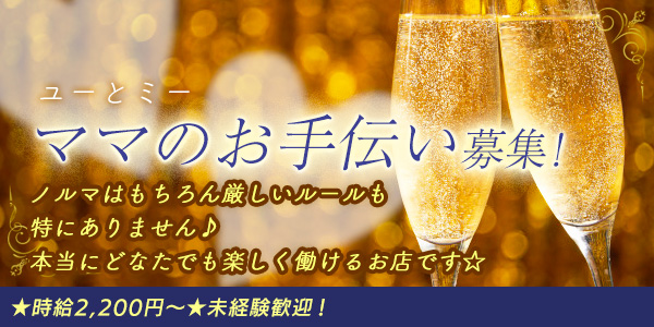 .゜。:+.゜。:+*. パブスナック ≪ユーとミー≫ スタッフ募集中 .゜。:+.゜。:+*. ◆当店について◆ ナイトワークのような ノルマ/罰金/連絡先交換などの営業強制一切ありません! バイト未経験の方や、 厳しいお店に疲れてしまった方にもオススメです♪ 出勤は月1回/2hだけでも大丈夫! 笑い声の絶えない楽しく働けるお店です ◆新人募集◆ ◆アットホームで温かいお店☆ 女の子やお客様に長年支持され続けてる 『皆の第二の家』みたいなお店です♪ 上下関係はほぼありません! ママも持ち上げられるのが苦手な人だから ママも含めて上下関係ナシ ◆メッセージ◆ 週1日&1回3h以内の勤務も大歓迎◎ 終電・早上がりも可能なので プライベートの合間を縫って 稼ぐことができます! まずは短期でお仕事してみて 気に入れば長期に切り替える! なんてのもOKです♪ ご応募お待ちしております! |