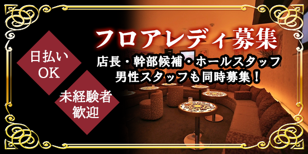 フロアレディ:体験時給6,000円~ 店長・幹部候補:月給35万円から+昇給・ボーナスあり ホールスタッフ:月給25万円から+昇給・ボーナスあり アルバイト ホールスタッフ:時給1,500円から+昇給あり ドライバー:日給5,000円から+ガソリン代・高速代を別途支給 |