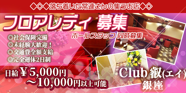 +:-:+:-:+:-:+:-:+:-:+:-:+:-:+:-: ★銀座 クラブ 叡 -エイ-★ フロアレディ・ホール/カウンター(男女)・キャッシャー大募集 +:-:+:-:+:-:+:-:+:-:+:-:+:-:+:-: 未経験者OK! 落ち着いた常連さんの集うお店♪ 完全週休2日、連休取得もOKなのでプライベートもバッチリ◎ ![]() ★+。。。+★+。。。+★+。。。+★+。。。+★ 仕事内容 (ホール/カウンター) 開店準備、営業中のホール業務、閉店の片付けをまずお任せします。 最初は不慣れなことがあると思いますが… 出来ることからでいいので、一緒に頑張っていきましょう! (キャッシャー) レジでのお会計、クローク業務、お金の管理等、 席へのご案内など多少の接客もございます! ★+。。。+★+。。。+★+。。。+★+。。。+★ ![]() ●・○・●・○・●・○・● ◎日払い可能 ◎社会保険完備 ◎交通費全額支給 ◎残業なし ◎昇給随時 ◎完全週休2日制 ●・○・●・○・●・○・● ![]() ◆…‥‥…━…‥‥…━…‥‥…━…‥‥…◆ ◆●◆ 仕事も1から丁寧に! ◆●◆ ◆…‥‥…━…‥‥…━…‥‥…━…‥‥…◆ 新しい職場、転職など色々不安はあると思います 特にナイトワークに不安をもたれる方もいらっしゃるよう… でも当店は銀座で長年、信頼と実績あるお店です。 未経験の方でも1から丁寧にお教えします。 当会社は研修も充実しているのでクラブで働くことが 初めての方でも安心して働けます。 人柄、やる気重視採用☆異業種からの方も 活躍しているのでお気軽にご応募下さい。 質問や相談、まずはお気軽にお問い合わせお待ちしております。 |